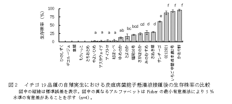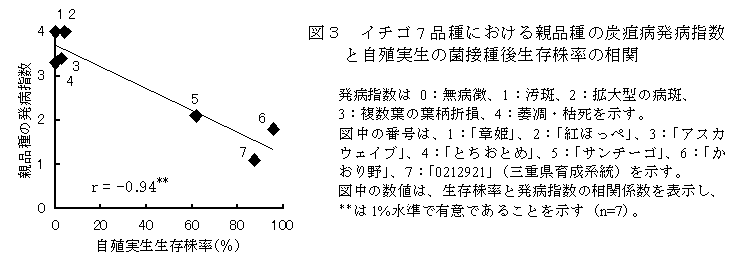 自殖実生の炭疽病菌接種後生存株率には、その親品種による品種間差がある(図2)。自殖実生の生存株率と栄養繁殖株を用いた親品種の発病指数の間には、有意な相関が認められる(図3)。このことから、自殖実生の炭疽病菌接種後生存株率を、その親品種・系統の抵抗性評価指標として用いることができる。 |