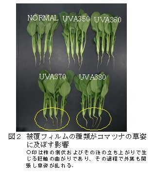 近紫外線の除去範囲の広いフィルムほど胚軸が徒長し草姿が乱れる傾向にある(図1、2)。UVA360では、NORMALおよびUVA350と同様に、UVA380(市販の近紫外線除去フィルム)よりも徒長の程度が小さく、草姿の乱れが少ない。