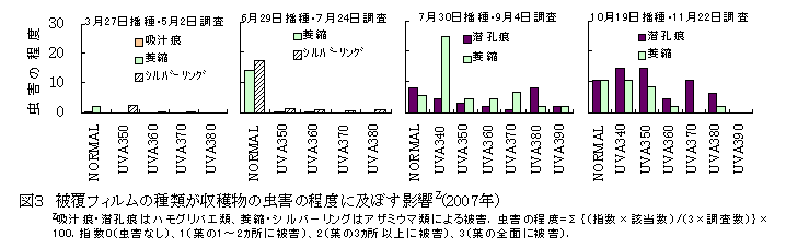 ハモグリバエ類による葉の吸汁痕や潜孔痕、アザミウマ類による葉の萎縮やシルバーリングなどの被害は、近紫外線除去範囲の狭いフィルムで大きい傾向にある。UVA360では被害が小さく、UVA380と同程度の害虫防除機能が認められる(図3)。 |