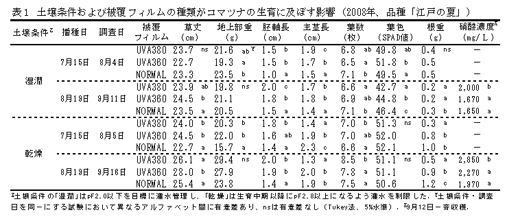 生育期に灌水を制限した乾燥土壌では、胚軸は播種直後の灌水の影響を受けるため、UVA380、360で徒長傾向にあるものの、主茎の徒長や葉数の減少はみられず、軟弱化しにくい(表1)。 |