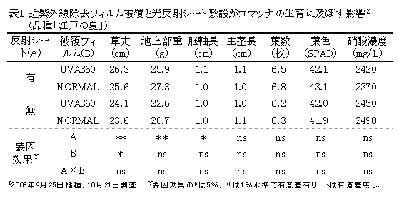 コマツナにおいては、いずれの資材によっても葉数や葉柄内の硝酸濃度への影響は認められないが、UVA360によって草丈が長くなり、光反射シートの敷設によって草丈および地上部重が増加する(表1)。 |