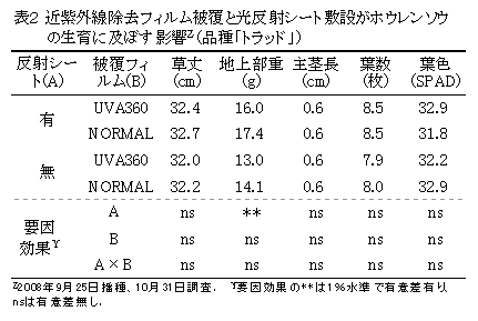 ホウレンソウでは、UVA360による影響は認められず、光反射シートの敷設によって地上部重が増加する(表2)。 |