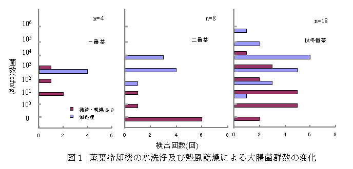蒸葉冷却機を水洗浄して茶葉残さを除去し、熱風で乾燥させた場合、冷却工程後の茶葉中の大腸菌群数は無処理のラインと比較して102程度低下する(図1)。洗浄後熱風乾燥を行わない場合、細菌の増殖に十分な水分が残るため、洗浄の効果は見られない(データ省略)。熱風処理は機械の乾燥を目的に行うが、調査時のネット表面の温度は65℃以上である。 |