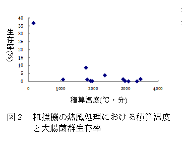製造開始前に粗揉機の庫内を熱風で処理(空運転)すると、底竹表面の細菌数を低減することができる。熱風温度を80℃、105℃及び120℃に設定し、底竹表面の茶温センサーの温度が耐熱性のない微生物を殺菌するのに有効な60℃以上になった時間から積算温度(温度×時間)を算出すると、底竹表面の大腸菌群をほぼ陰性とするためには3000℃・分以上の処理が必要である(図2)。基準風量で熱風温度設定が80℃の場合60分以上、105~120℃の場合45分以上が目安である。 |
