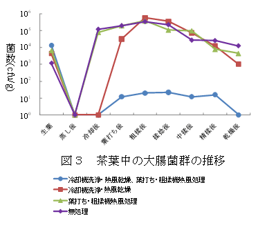 県内の荒茶製造工場において実施した調査の結果から、蒸葉冷却機の水洗浄及び熱風による乾燥と、葉打・粗揉機の空運転による熱風殺菌はいずれか単独のみの処理では荒茶の大腸菌群数に差は見られず、蒸葉冷却機、葉打ち機、粗揉機のすべてを処理した場合のみ荒茶の細菌数を一定レベル以下に維持することが可能である(図3)。 |