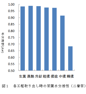 荒茶製造工程における茶葉の水分活性は、生葉から揉捻工程までは0.97Aw以上と高い値を示し、微生物が増殖しやすい環境にある。微生物が増殖するのに必要な最低生育水分活性は大腸菌で0.93Aw、一般的な細菌で0.90Awと言われており、それらに近いもしくは下回る値となる中揉以降の工程では細菌が増殖する可能性は低い(図1)。 |