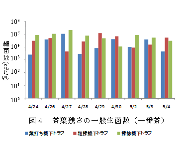 汚染源として細菌が増殖した茶葉残さの混入が想定されることから、ライン稼働直前に葉打ちから揉捻工程までの機械上の茶葉残さを採取し、細菌数を調査したところ、一番茶期における茶葉残さ中の細菌数の平均は、一般生菌数が103~105cfu/g、大腸菌群数は102~103cfu/gのオーダーである(図4)。 |