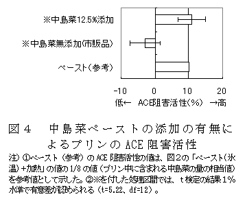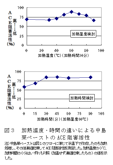 中島菜をペースト化し60℃で30分加熱することにより、アンジオテンシンⅠ変換酵素(ACE)阻害活性を向上させることができる。本技術で処理した中島菜をプリン等の食品に添加・加工処理してもACE阻害活性が維持される。 | ||||||||