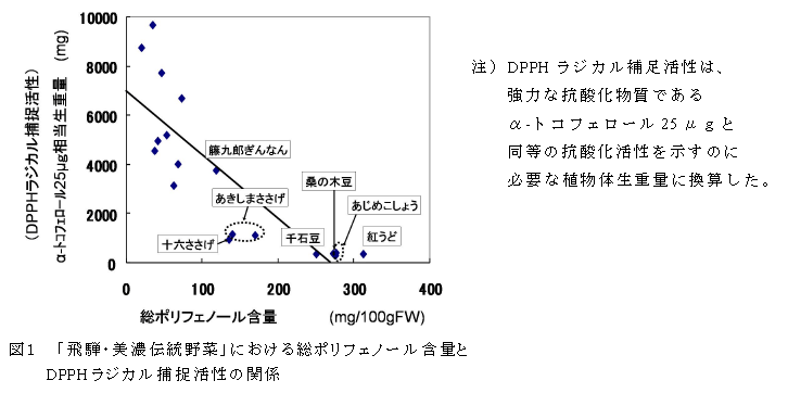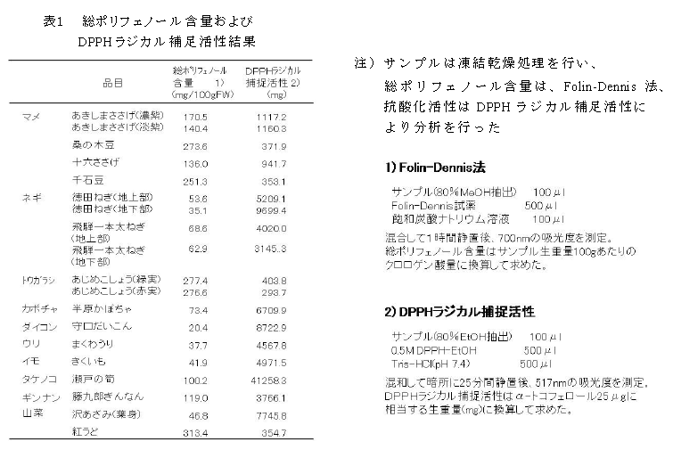 岐阜県地域特産野菜『飛騨・美濃伝統野菜』計15品目の総ポリフェノール含量とDPPHラジカル補足活性間には高い相関がある。これらが高い品目は、「桑の木豆」、「千石豆」、「あじめこしょう」および「紅うど」の4品目である | ||||||||||