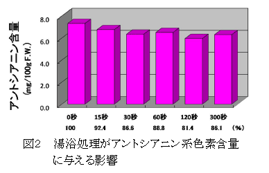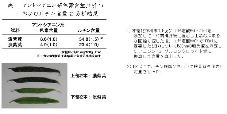 岐阜県地域特産野菜「あきしまささげ」は主要ポリフェノールとしてアントシアニン系色素およびルチンを含み、淡紫莢より濃紫莢にて含量が高い。また、これらの成分は300秒間の湯浴処理を行っても80%以上が残存する。 | ||||||
