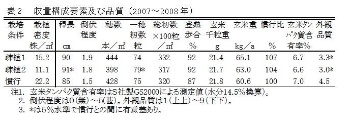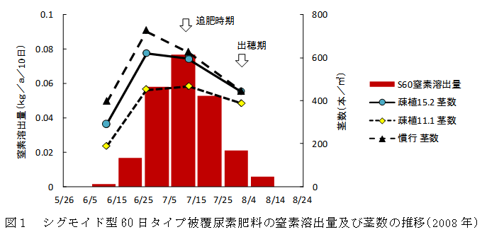 水稲「なすひかり」において、全量基肥肥料(速効性肥料:シグモイド型60日タイプ被覆尿素肥料=4:3)を用いて、栽植密度を15.2株~11.1株/m2とした疎植栽培により、慣行栽培と同程度以上の収量を確保できる。 | ||||||||