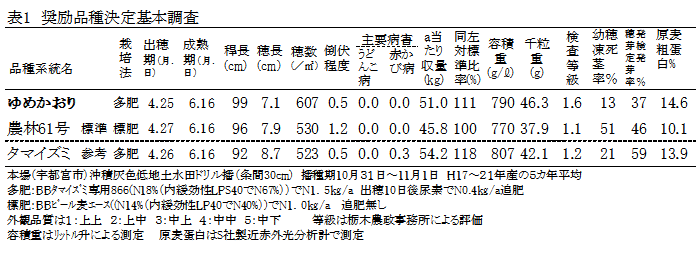 「ゆめかおり」(組合せ:西海180号/KS831957)は「農林61号」と比較して、次のような特徴があり、栃木県奨励品種(認定)として採用した。 | ||||||||||