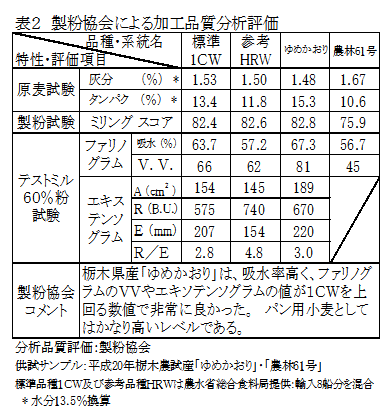 栃木県では、一部地域で高蛋白質のため「農林61号」の評価が低くなる傾向がある。また、「農林61号」や醤油醸造用小麦「タマイズミ」で縞萎縮病が年々深刻化してきている。「ゆめかおり」(平成21年6月、長野県育成)は、これら栽培上の欠点を補い、グルテンの質が格段に優れ、パン・餃子等に新たな需要拡大が見込まれることから、奨励品種(認定)として採用し、「農林61号」の一部に替えて本県麦の生産安定拡大を図る。 | ||||||||||