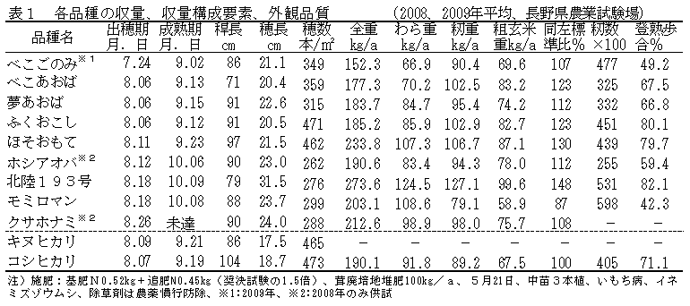 長野県須坂市(標高340m、中粗粒グライ土)での成績であり、2カ年とも秋期に台風の襲来は なかった。 |