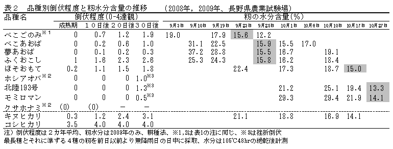 籾水分は、どの品種も成熟期後20日程度で13~16%程度まで低下する(表2)。 |