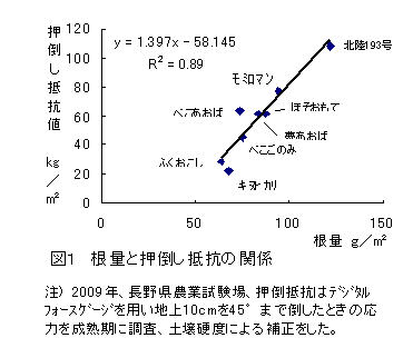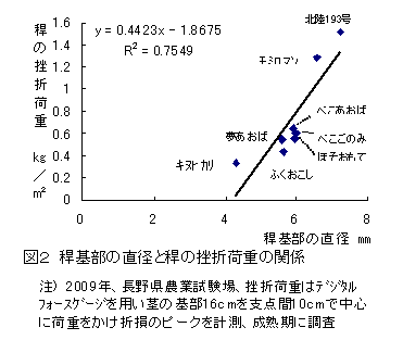 稈基部の直径と挫折荷重、根量と押倒抵抗は正の相関関係があり、その値が大きいほど倒伏に対 する抵抗性が強まり、「モミロマン」、「北陸193号」では顕著である。(図1、図2、表2)。 |