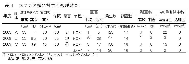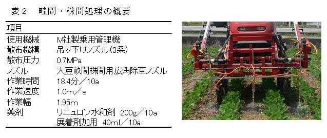 リニュロン水和剤の畦間・株間散布は、ダイズほ場で問題となっているヒロハフウリンホオズキに対して茎葉処理効果及び土壌処理効果とも高い。乗用管理機による畦間・株間処理の作業時間は18.4分/10aと実用的な作業能力である。 | ||||||||