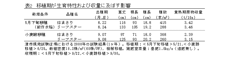 小麦跡移植栽培で飼料米として利用する際には、9月中旬以降に出穂する品種では成熟しないことがある。 |