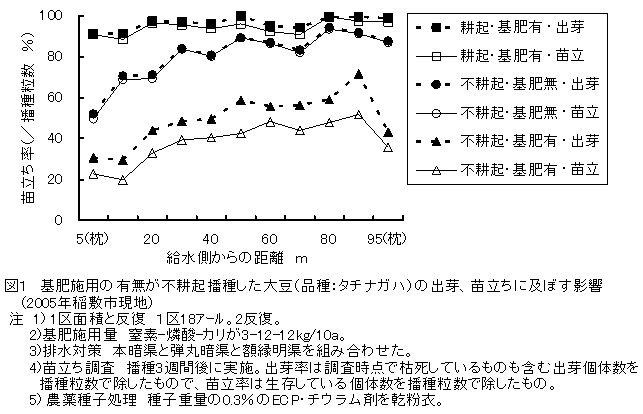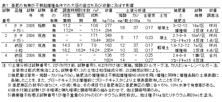 水田転換畑の大豆不耕起栽培では苗立ち不良が生じやすいが、これに加えて化成肥料の播種時施用は苗立ち不良や立ち枯れの発生を助長し、立毛数の減少による減収を生じることが多い。そのため関東地域の大豆不耕起栽培では基肥を施用しない方が良い。 | ||||||||