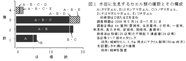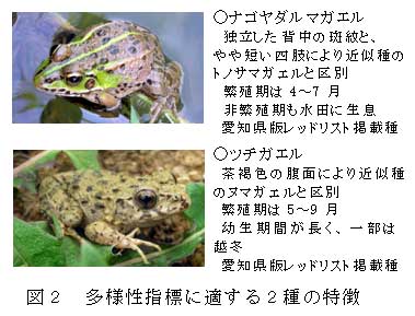愛知県平野部水田に生息するナゴヤダルマガエルまたはツチガエルは、移植日、水深、農薬使用などの環境要素に影響されるカエル類の多様性を反映するため、生物多様性指標の一つとして適する。 |