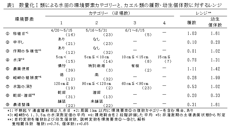 種数に影響する主な環境要素(レンジ0.5以上)は、移植日、作期の多様性、水深、農薬使用、水路の深さが挙げられる(表1)。また、幼生の個体数に影響する環境要素は、それらに加え畦畔の植被度と農道整備である(表1)。 |