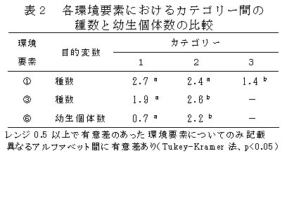 カテゴリー間の比較では、移植日が6/1以降、作期の多様性や畦畔の植被度が低いほ場で種数または幼生個体数が少なく(表2)、これらの環境要素は幼生の成育期間や成体の生息環境に対する影響が大きい。 |