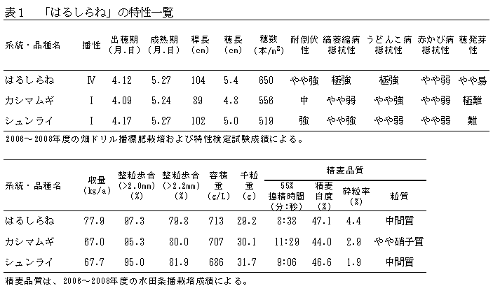「はるしらね」は、軟質・高白度で精麦品質が優れる「東山皮96号(後のファイバースノウ)」に、プロアントシアニジンフリー遺伝子(ant28 )を有する「泉系A133-3」を交配したF1を母として、早生・短強稈・縞萎縮病抵抗性で精麦品質が優れる「東山皮101号(後のシルキースノウ)」を父として人工交配し、系統育種法により育成した六条皮麦で、以下の特徴がある(表1)。 | ||||||||||||||||||