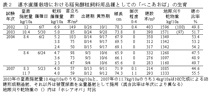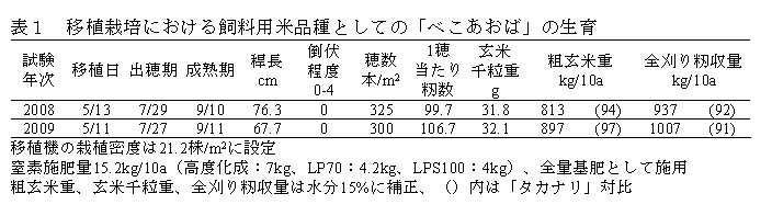 茨城県南部で「べこあおば」を多肥条件で栽培すると、5月中旬移植で粗玄米重が800kg/10a以上となり、飼料用米として利用できる。6月上旬播種の湛水直播栽培では、黄熟期の地際刈り乾物重が1500kg/10a以上となり、稲発酵粗飼料として利用できる。 |