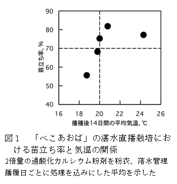 「べこあおば」を湛水直播栽培で5月下旬〜6月上旬に播種すると、8月中旬〜下旬に出穂し、9月中旬〜下旬に黄熟期に達して稲WCSとして収穫できる。大麦を11月上旬までに播種し、5月中旬に大麦WCSとして収穫する周年粗飼料生産に利用できる。播種時期が6月下旬になると、黄熟期は10月上旬まで遅れる(表2)。播種後14日間の平均気温が20℃以上となる条件では、苗立ち率が70%を上回る(図1)。稈長は移植栽培と同様に短く、湛水直播栽培でも倒伏は軽微である(表2)。 |