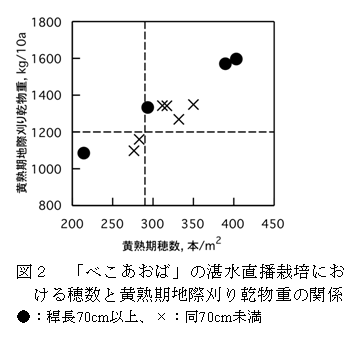 5月下旬以降に播種する湛水直播栽培において、稲WCSとしての「べこあおば」の黄熟期地際刈り乾物重は、穂数が多いほど、また稈長が長いほど大きい。穂数が290本/m2以上となる条件で、乾物重は1200kg/10a以上となる(図2)。窒素施肥量10kg/10a以上の多肥条件では、乾物重は「ホシアオバ」と同程度で、1500kg/10aを上回る。地際刈り乾物に占める穂の比率は50%前後となり、穂重型の生育を示す(表2)。 |
