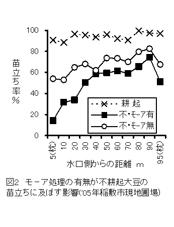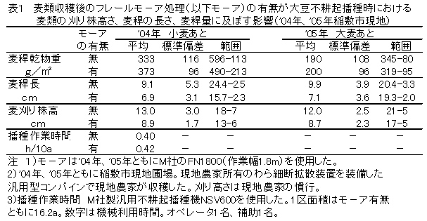前作麦稈の焼却の代替として行われるフレールモーア処理は土壌の圧密化等を通して大豆の苗立ちを悪化させ減収を招く場合がある。麦収穫時にコンバインのわら細断拡散装置を利用すれば、フレールモーア処理を省いても不耕起播種の作業性への影響は小さい。 | ||||||||
