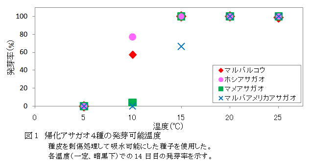 マルバルコウとホシアサガオは10℃から、マメアサガオとマルバアメリカアサガオは15℃から発芽できる(図1)。温暖地では4種は日平均気温が10~15℃になる4月中旬頃から出芽し、10月下旬頃まで出芽する(図2)。 |