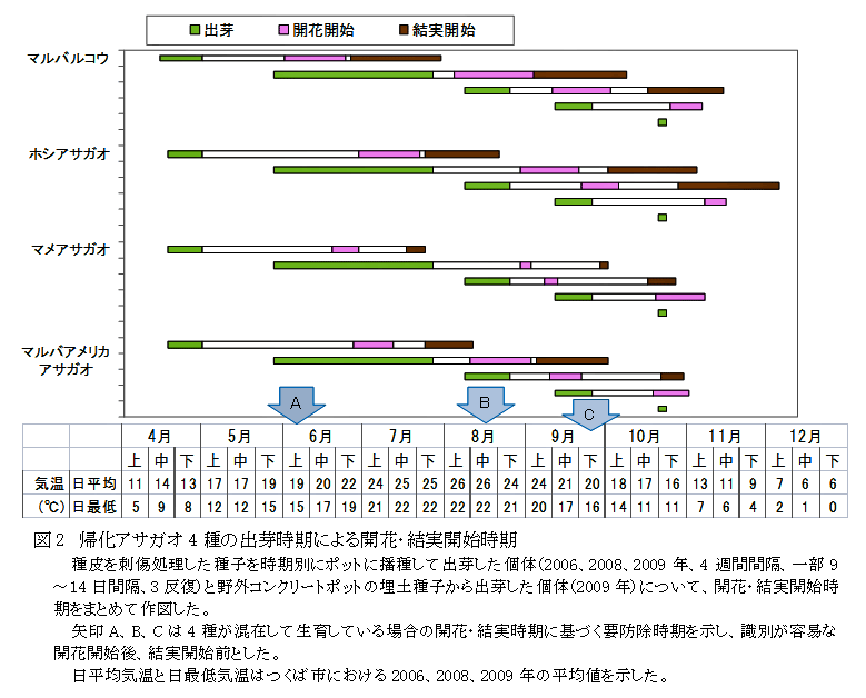 4月中旬に出芽した帰化アサガオ類4種はいずれも6月中に開花を開始する。したがって、種子生産を防止するには、開花・結実時期の早いマルバルコウに合わせて、まず6月上旬の防除が必要である(図2、矢印A)。 |