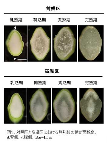 高温区で生育させた場合の穎果では、乳熟期から糊熟期にかけて白濁が発生し始め、完熟時に胚乳中心部に白濁を形成する心白粒や乳白粒、背部に白濁を形成する背白粒が多発する(図1)。 |
