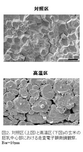 高温区の胚乳中心部の白濁部では、アミロプラストの間に大きな隙間が見られ、単粒と不完全な複粒のアミロプラストが多く観察される(図2)。すなわち、デンプン蓄積の初期段階においてデンプン合成が阻害され、デンプン粒の発達が不十分なまま成熟期を迎えたと考えられる。 |