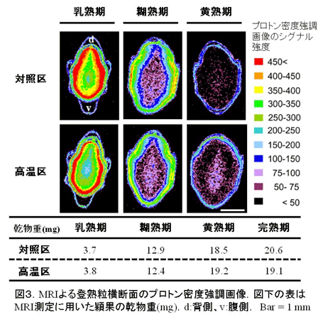 MRIを用いて乳熟期・糊熟期・黄熟期におけるイネ穎果の中央部横断面の水分分布をみると、高温区は対照区と比べて、乳熟期では粒重は同程度であるが胚乳中心部の水分が低く、一方、糊熟期以降では高い特徴がある(図3)。すなわち、乳熟期から糊熟期にかけての胚乳中心部における水分の早期凋落は、胚乳中心部における白濁の発生と時期的・空間的にほぼ一致する。 |