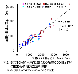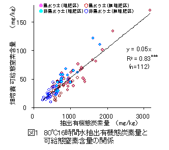 80℃16時間水抽出法では、抽出有機態炭素量からも可給態窒素含量を推定可能である(図1)。 |