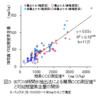 80℃16時間水抽出法による有機態炭素量(TOC)と化学的酸素消費量(COD)は極めて高い正相関を示す(図2)。このため、市販のCOD簡易測定キットを用いた可給態窒素含量の簡易推定が可能である(図3)。 |