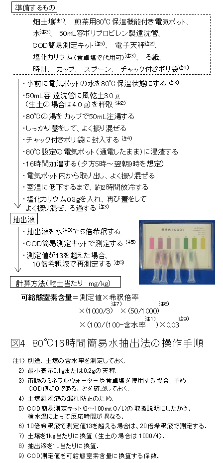 80℃16時間水抽出法は、電気ポットやCOD簡易測定キットなど、家庭で調達可能な道具で実施できる(図4)。また、市販のミネラルウォーターを抽出・希釈用に使用でき、毒・劇物薬品を使用しないので、生産者や技術指導機関および民間土壌分析センター等での簡易診断が可能である。 |