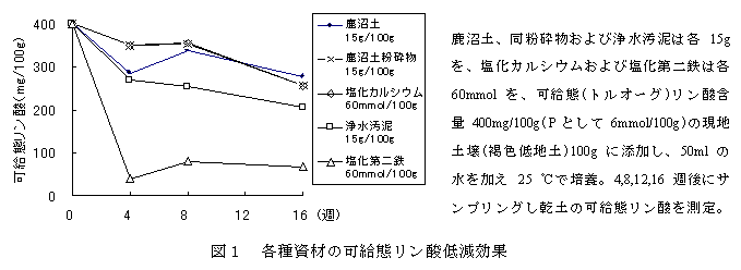 可給態リン酸含量400mg/100gの土壌(褐色低地土)に、リン酸を吸着する効果があると考えられる5種類の資材または試薬を混合し25℃16週間培養したところ、塩化第二鉄、次いで浄水汚泥(浄水場発生土の高分子処理造粒脱水ケーキ)が、可給態リン酸含量を低下させる効果が高い(図1)。 |