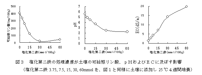 可給態リン酸含量を300mg/100gまで低下させるために必要な塩化第二鉄の処理量を実験的に検討したところ、7.5mmol/100gの処理で300mg/100g以下まで下げることが可能である。塩化第二鉄の処理量が増加すると著しいpH低下とEC上昇が起こる(図3)。 |