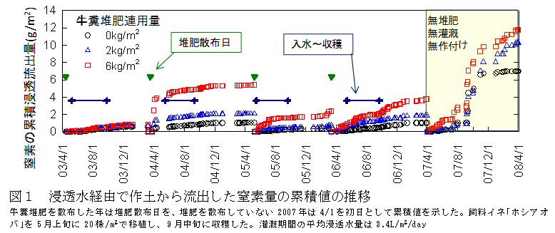 牛糞堆肥の多量連用や散布から入水までの期間が長い早期散布では、窒素の浸透流出リスクが高まる。収穫後から堆肥散布までの浸透窒素流出量はイネ栽培期間を上回らないが、休耕・無潅漑とすると、過去の堆肥の施用量に応じて窒素の浸透流出量が増大する。 |