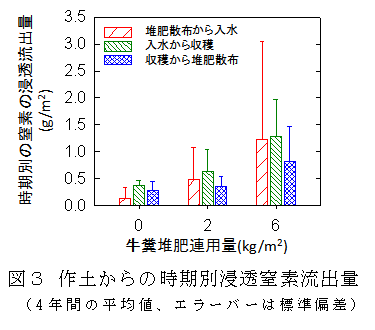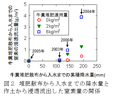 牛糞堆肥散布から入水までの期間に浸透流出する窒素量は同期間の降水量の増加に伴い増大し、牛糞堆肥連用量が多いほど浸透水経由で流出する窒素量が大きい(図2)。 |