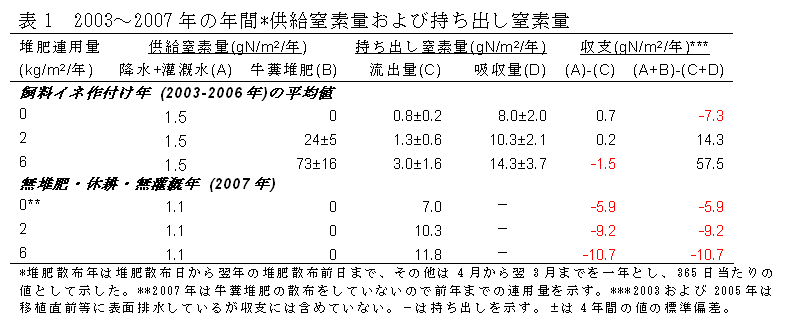 中央農研(茨城県つくば市)で行った試験であり、気象・土壌の類似した地域において、牛糞堆肥を用いて飼料イネを栽培する際の環境影響評価の指針となる。 |
