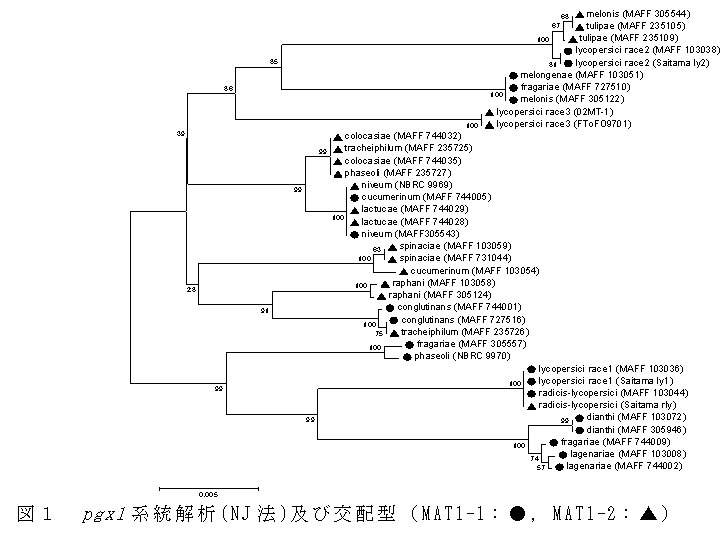 polygalacturonase遺伝子は同一の分化型でも異なる交配型の場合(f. sp. cucumerinum など)や異なる枝に分けられる場合(f. sp. fragariae など)があった(図1)。 |