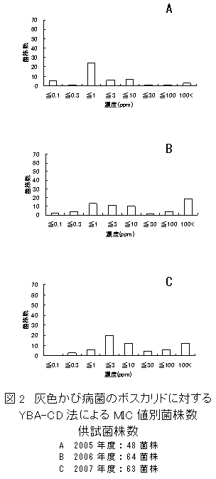 ボスカリドにおいて、トマト、ナス及びイチゴの果実、葉、茎の標徴部から分離した2005~2007年採取菌株を用いて検定すると、YBA-PD法では、MIC値が概ね1ppm以下と判断される(図1)。一方、YBA-CD法では、MIC値が各濃度で認められ、100ppmよりも高いと判断される菌株がある(図2)。 |