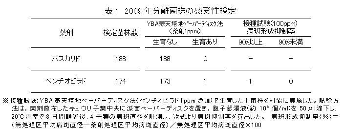 両剤ともYBA-PD法では、MIC値が概ね1ppm以下と判断されることから、SDHI剤1ppm含有YBA-PD法を用いて、同様に分離した2009年採取菌株の感受性検定を行なったところ、耐性菌は認められない(表1)。 |