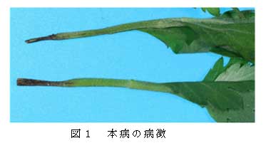 本菌分生子懸濁液にキク健全挿し穂(品種:「神馬」)を浸漬した後、育苗用土を詰めたトレイに挿し、7~14日間育苗したところ、接種区では、しおれが目立ち、挿し穂の切断面が黒変する。多くは発根するが、一部の挿し穂は発根しない。病斑部からは接種菌が回収される。 |