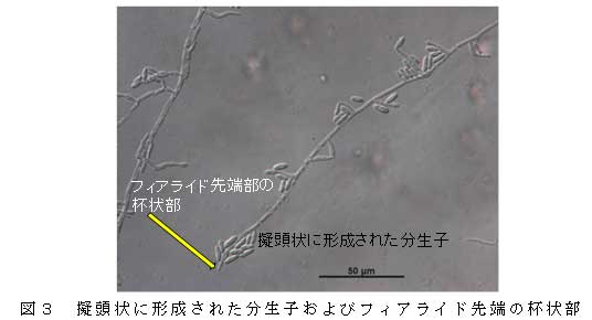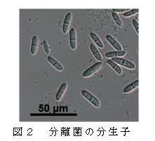 本菌はジャガイモ煎汁ショ糖寒天培地上で、5~35℃で生育する。生育適温は25℃である。25℃での菌糸生育速度は3mm/日である。本菌はモノフィアライド(アデロフィアライドもあり)上に分生子を擬頭状に形成する(図3)。分生子は無色、平滑、紡錘形で2細胞が多い(時に単細胞)。分生子の大きさは2細胞のもので13.5×4.4μm、単細胞のもので8.1×2.4μmである(表1)。本菌のrDNA-ITS領域の塩基配列は Plectosporium tabacinum のそれと99%一致する。 |