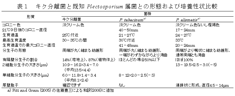 以上の培養性質、形態的特徴およびrDNA-ITS領域の塩基配列から、本菌はPlectosporium tabacinumと同定される。キク挿し穂の腐敗症状は記録が無いため、新病害と考えられ、キク苗腐敗病(cutting rot)と呼ぶことを提案する。 |